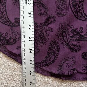 Good condition. Women’s Ariat long sleeve, button down shirt. Features front and back western yokes , 2 front pockets, purple snap closure, and paisley print throughout the translucent fabric.
