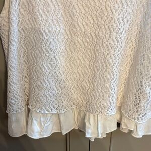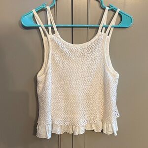 Chic white lace tank with double straps. Features a stylish ruffle hem. Ideal for layering or wearing alone.