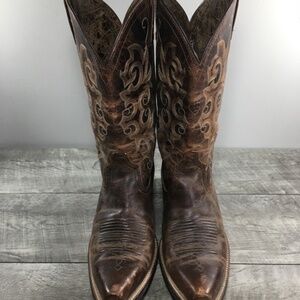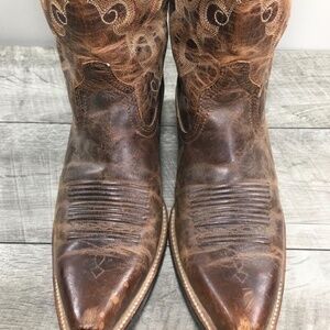 Up for sale is a good condition pair of Ariat Womens 100010979 Alabama Brown Leather Cowgirl Western Boots. Size 8.5 B, medium US. Leather uppers. Rubber soles. From smoke-free home. Clean inside and out. Very well built and sturdy. Approximate Outside Dimensions: 11.75 inches heel to toe by 4 inches across the ball of footwear by 1.75 inches tall heels by 13.5 inches tall.