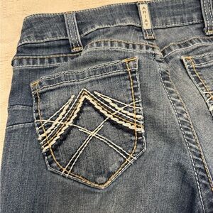 Stylish boot cut jeans by Ariat. Deep blue color. Comfortable and versatile.