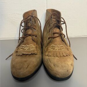 These Ariat Boots feature a rich brown leather construction with a classic lace-up front and a sturdy, rounded toe. The ankle-high design and rustic aesthetic make them a versatile choice for casual wear, offering both style and durability. Good used condition