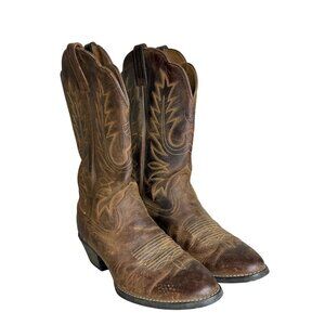 These Ariat cowboy boots are crafted from durable leather and feature intricate western stitching. Designed for comfort and style, they're suitable for casual and semi-casual settings.