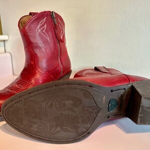 Leather upper with western inspired stitching, side zipper, rubber outsole, approx. 7" boot shaft height, approx. 2.5" heel