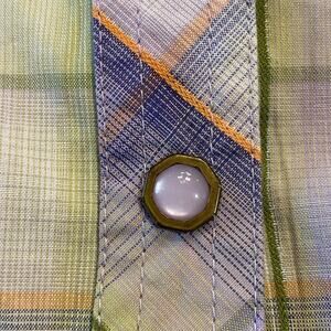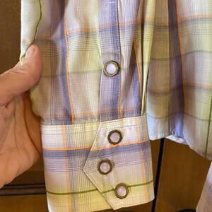The shirt is a size large and features pearl snap buttons, adding a touch of western flair.