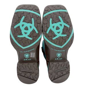These Ariat Women's Anthem Shortie Boots offer a blend of style and functionality. Designed with a leather upper, they feature a square toe and a oil/slip resistant durable Duratread outsole for maximum wear. The striking brown and turquoise color combination adds a touch of flair, while the boots' construction ensures comfort and stability for all-day wear.