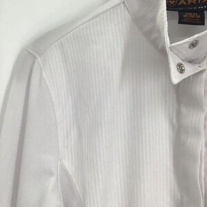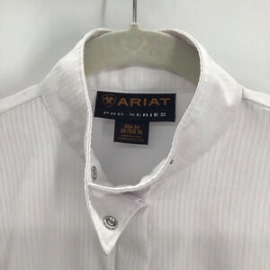 Nice Ariat women’s Pro Series riding shirt. Features high collar, side sheer panels for breathability & full front snap up. Fabric 100% Polyester