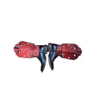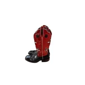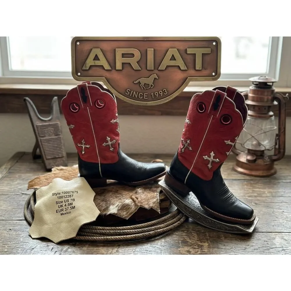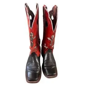 Make a bold statement with these Ariat Rodeobaby Rocker boots. Featuring a striking red leather shaft detailed with intricate silver-toned cross overlays and wing-inspired embroidery, these boots are designed for the rider who loves standout style. The black leather foot provides a classic contrast, while the wide square toe and rocker heel offer a modern silhouette. Built with Ariat’s performance technology, they provide excellent stability and cushioning for all-day wear. These are in very good condition and ready to add some edge to your western collection.