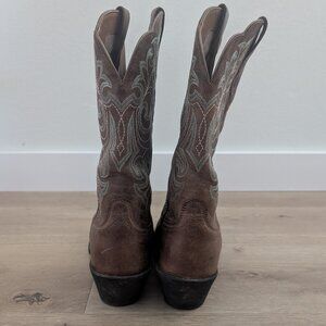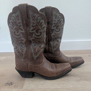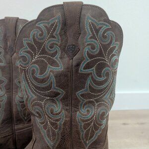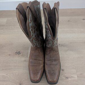 Ariat western style boot with a square toe. The upper is made of leather. Only been worn twice and needs to be cleaned up a bit. Some wear to the boot (see pictures). The left shoe fits a little more snugly than the right and will need to be stretched out.