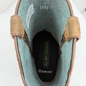 Ariat's Round Up Cowboy Boots offer a blend of classic Western style and modern comfort technology. With their wide square toe and stylish copper blanket emboss, these boots are crafted for reliability. The ATS cushioning insole ensures all-day comfort, while the leather upper provides durability.