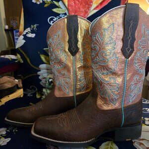 **Toasted Blanket Ariat Western boots with embroidered design. (originally $189). these are brand new. I tried them on with an insert and sock. My naked foot has gone nowhere near them. :p
