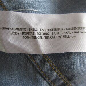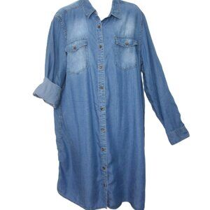 Classic western charm and vibes in soft 100% Tencel fabric that looks like chambray or lightweight denim (but is not actually denim). It drapes nicely over the figure. Two front button pockets. Factory fade over the upper chest and pocket area. Long sleeves that can be rolled if desired. Approximately knee length. Festival southwest Sante Fe country