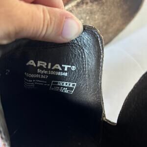 Ariat Womens Size 9.5B Dixon Brown R Toe Snake Print Booties Boots Western Cowgirl. The outsole and upper is leather and the balance is manmade. The exteriors are in excellent condition. Slight wear on the heels and soles.