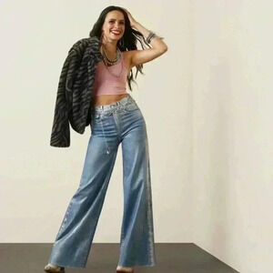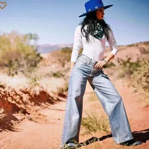 With a subtle metallic finish that adds a little sparkle to any outfit, this ultra high-rise jean is ready for everything from holiday parties to Vegas. The hem is designed to subtly fray over time, while the wide leg shows off just a glimmer of your favorite boot toes.