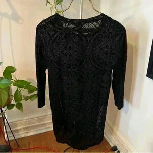 Very good preowned condition. Runs large and would fit a medium as well. Very cute with leggings as it covers the backside. Sheer where the velvet print is missing. Looks great with a black cami underneath.