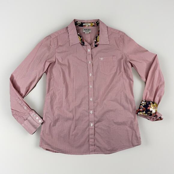 Ariat women’s Kirby Stretch long sleeve button-down shirt in a pink and white micro-stripe pattern. Features a flattering fitted cut with stretch for comfort, plus floral contrast fabric at the inner collar and cuffs for a stylish western touch.