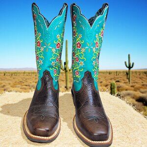 Features: Square toe, stacked Western heel, Stand out in western style with these stunning Ariat cowboy boots featuring rich brown leather footbeds and vibrant turquoise shafts decorated with red, yellow, and orange floral embroidery. Designed with Ariat’s quality craftsmanship, these boots are perfect for rodeo nights, country concerts, or everyday western wear. Retail $199.00