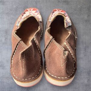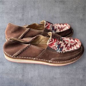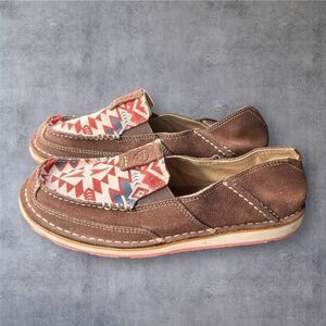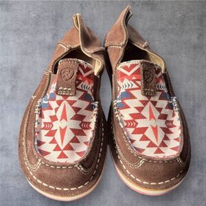 Keywords: Ariat, Cruiser Slip-On, women's casual shoes, brown slip-on, Aztec pattern, comfortable footwear, leather and textile, casual occasions, size 8B, new condition.