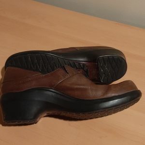 Brown leather clogs, elastic side gussets, leather/foam insert, arch support, rare style!