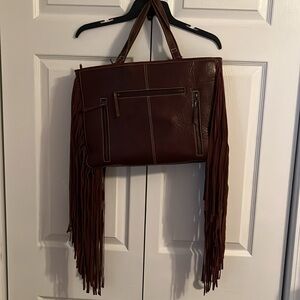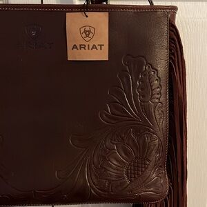 Brown Ariat purse with engraved detail and fringe. Inside lining intact with additional glasses type holder that is removable