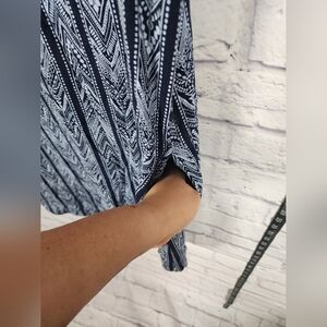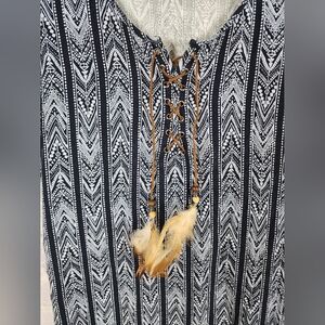 Ariat women's casual dress featuring a bold navy and white tribal-inspired geometric pattern. The dress is crafted from 100% rayon, making it lightweight and breathable, ideal for warm weather. It has short sleeves, a lace-up neckline adorned with leather ties, decorative beads, and feathers, adding a boho-chic touch. The relaxed fit and side pockets enhance its practicality and comfort, making it perfect for everyday wear or casual outings. The intricate design and unique details reflect Ariat's blend of Western and contemporary style.