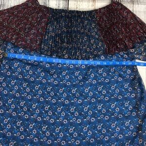 Beautiful boho-inspired blouse by Arie in a unique patchwork floral design. Features sheer lightweight fabric with smocked detailing at the neckline and pleated bell sleeves. Perfect for casual wear, layering, or a chic festival look.