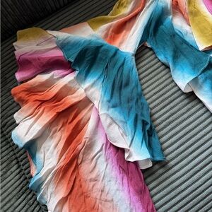 Off-shoulder blouse with layered ruffle tiers. Bright vertical stripes in multiple hues. Lightweight, flowy fabric with playful movement. Easy to pair for a vibrant look.