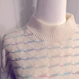 Super cute vintage cream/pastel sweater by Arielle with rib knit at neckline and sleeves. Noted small stain on right sleeve hem and left back of sleeve (pictured in 5th photo down); otherwise noted to be in great condition.