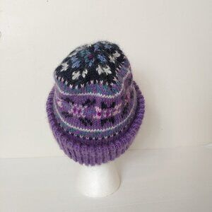Vintage Aris Purple Knit Hat Fair Isle or Scandinavian Print Beanie Style One Adult Size. Made in the USA. Great condition