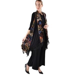 Aris.A Evening Vest Chiffon Floral Interspersed with Black Knit Inset Panels and Drapes into a Flowing high-low semi-flounced asymmetric hemline (Stock photo is a different vest made by the same company) Artsy Art to Wear Regencycore Royalcore BOHO Mixed Media Bohemian Art Teacher Cocktail Stevie Nicks Harry Potter Formal Whimsigoth Whimsygoth Goth Witchy Witchcore Sorceress Christmas Gift
