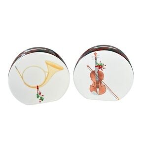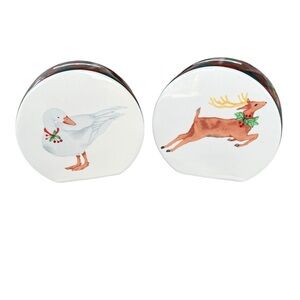 Arita Tartan Plaid Round Christmas Holiday Salt & Pepper Shaker Set. Featuring a double-sided design with a Christmas Goose and Deer on one side, and wreath adorned instruments on the other. These are part of a discontinued pattern no longer being made. A classic and whimsical add to your Christmas tablescape!