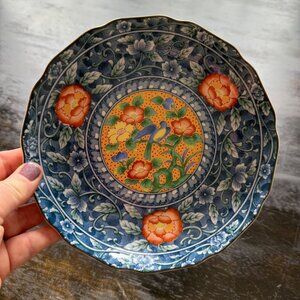 This Vintage Arita Porcelain Bowl is a stunning example of Japanese Imari Ware. It is beautifully hand-painted and features flowers and a bird in a central medallion with a gold background. Surrounding the medallion is an array of blue and white florals, including 3 larger orange peony flowers. A lovely scalloped rim frames it. Arita ware is still highly sought-after by lovers of Japanese Porcelain.
