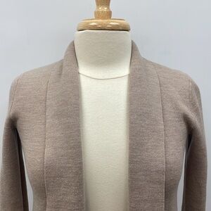 Great preowned condition Aritzia Babaton Cardigan Size: XXS -Relaxed fit -Long sleeves -Open front -Shawl collar -Belt loops (belt not included) -Two slit pockets -Solid tan knit -90% merino wool, 9% nylon, 1% spandex Approximate measurements laying flat... Shoulder to hem: 27" Armpit to armpit: 17" Waist: 18.5" All reasonable offers are considered :) Ships next business day! Bundle with 1+ items and automatically save 25%