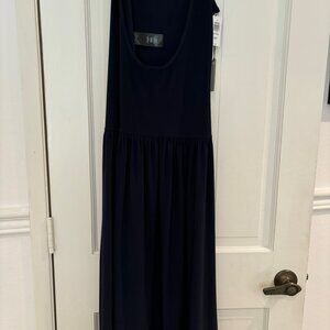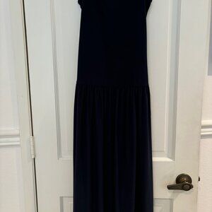 This is a Aritzia Babaton Astonish Stretch Jersey Dropped Waist Dress Size Sm scoop neck fit-and-flare maxi dress. The color is 'admiral' which is a deep navy blue. It has a dropped waist. It's cut from yummy drapey, stretch jersey with a smooth, cool feel. The back is scooped low. Length is Maxi — Intended to hit at the shin