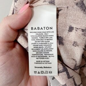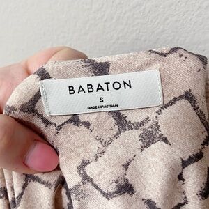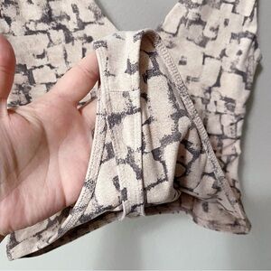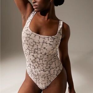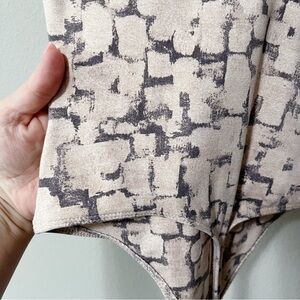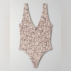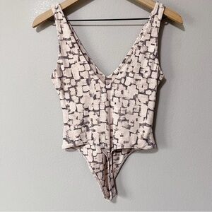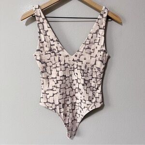 Babaton for Aritzia Contour Double V Bodysuit in Fawn Pink/Gull Grey Rose print. Size small. V-neck. Thong bottom. Pre-owned, excellent used condition.