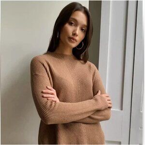 Aritzia Babaton Chalmers mock neck sweater. Tan, camel, brown. Ribbed knit. Curved hem.