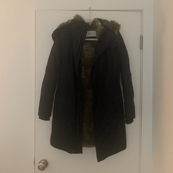 HI @b_5555 The fur is lined only in the back and front; it's not in the sleeves. I'm just under 5'3”, and the bottom hits my mid-thigh. Hope that helps!