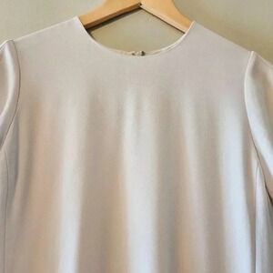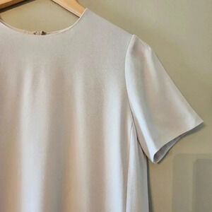 This is a t-shirt mini dress with an A-line silhouette. It's made with Terado", an exclusive Japanese crepe that's matte crepe on the front and satin on the back.