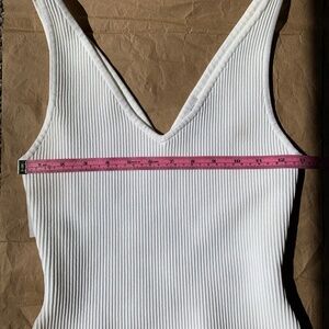 This is a new with tags attached Aritzia Babaton Sculpt Knit Double V Tank in the color white, in a size small. This is a waist length tank in a thick, ribbed material.