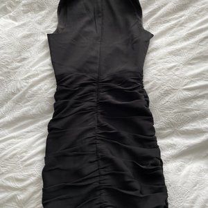 Black V-neck mini dress with gathered sides and ruching in the back. It’s made with a drapey, high-stretch fabric.