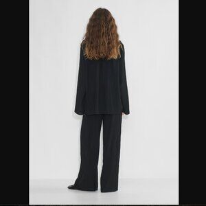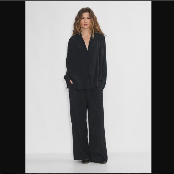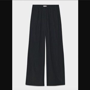 These are relaxed pull-on pants with inseam pockets, an elastic waist and an ultra-wide leg. They're cut from lightweight, drapey plisse fabric with a pleated texture. This fabric is sourced from an innovative Japanese mill.