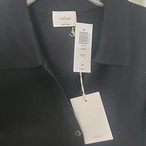 This brand new with tags Aritzia Wilfred Cove sweater dress is the perfect addition to any wardrobe. Perfect for a cool spring evening in the city or around town, the sophisticated collared neckline and button front make it a stylish choice for any casual occasion. The long sleeves and knit fabric type ensure that it will keep you warm in the winter, fall, and spring seasons. It comes in a classic black color and is made from a combination of polyester and viscose materials. The dress length is long, making it a versatile piece that can be dressed up or down. It is recommended to hand wash only for garment care. This Wilfred sweater dress is a must-have for any fashion-forward woman looking for a comfortable and chic option.