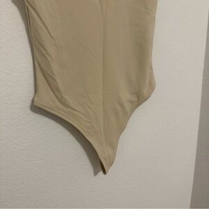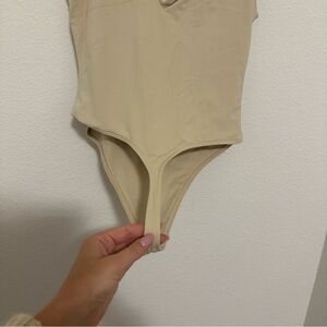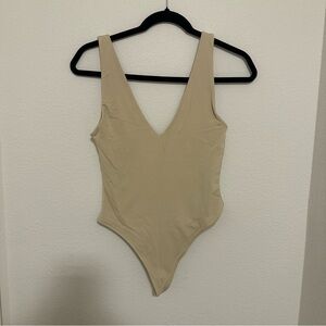 Elegant cream bodysuit. Deep V-neck design. Perfect for layering.