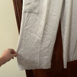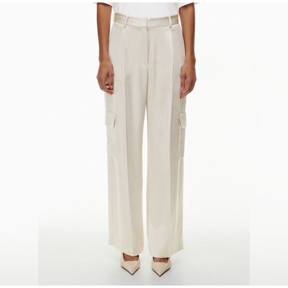 Elegant wide leg pants. Features cargo pockets. Perfect for a chic look.