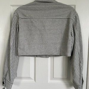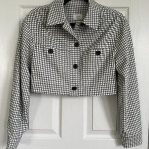 Never worn. From Aritzia / Wilfred. This is a softly structured jacket with a buttoned closure and patch pockets. Made from a stretchy, crepe-like gingham fabric with a subtle texture.