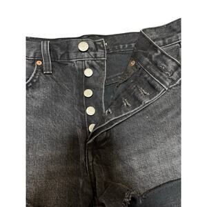 Details: High-rise waistline with vintage-inspired silhouette. Faded black rigid denim (non-stretch). Raw cutoff hemline with lived-in character. Classic button-fly closure.