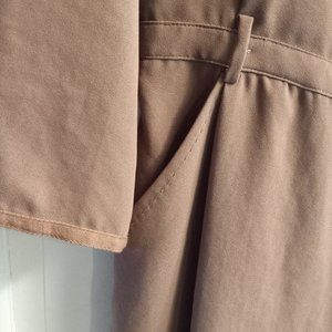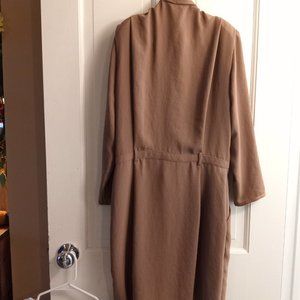 Excellent used condition, I do have the waist tie not shown in the picture. Nice drapey fabric, does not wrinkle. Fits true to size. I used to be 5'3 105 lb and it was perfect. Eventually I moved the waste button out an inch, as you can see in the picture. The Tie covers it up so it's not a problem. It hits below mid thigh. Bracelet length or 3/4 sleeves. Camel tan color. Thank you for looking.
