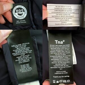 Good used condition; unnoticeable marks on cuffs and arms as shown. I did wash the jacket with mild detergent and it got a couple of them out (except for the ones shown). Two punctures on one arm.