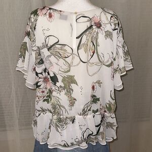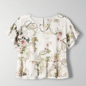 Aritzia L Little Moon Ruffle Sleeve Floral Peplum Blouse White Green