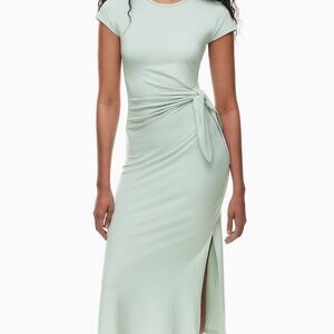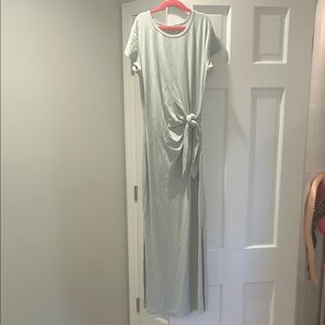 Chic light gray maxi dress with side tie detail. Short sleeves and flowing silhouette. Perfect for versatile styling. Only been worn once no stains.