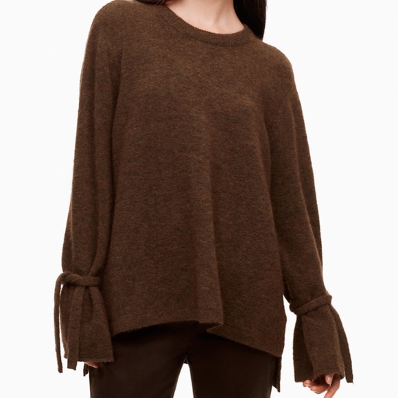 The Group by Babaton Malcorra Sweater Warmth in wool and alpaca. This sweater is knit with a plush, warm wool-alpaca yarn. The dropped shoulder is specially tailored for a flattering, feminine fit. Ties at the cuffs let you play with the sleeve volume. Super soft and completely sold out online!